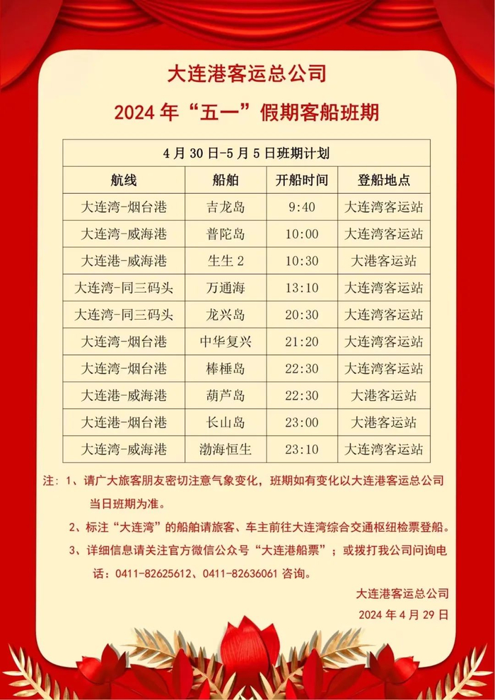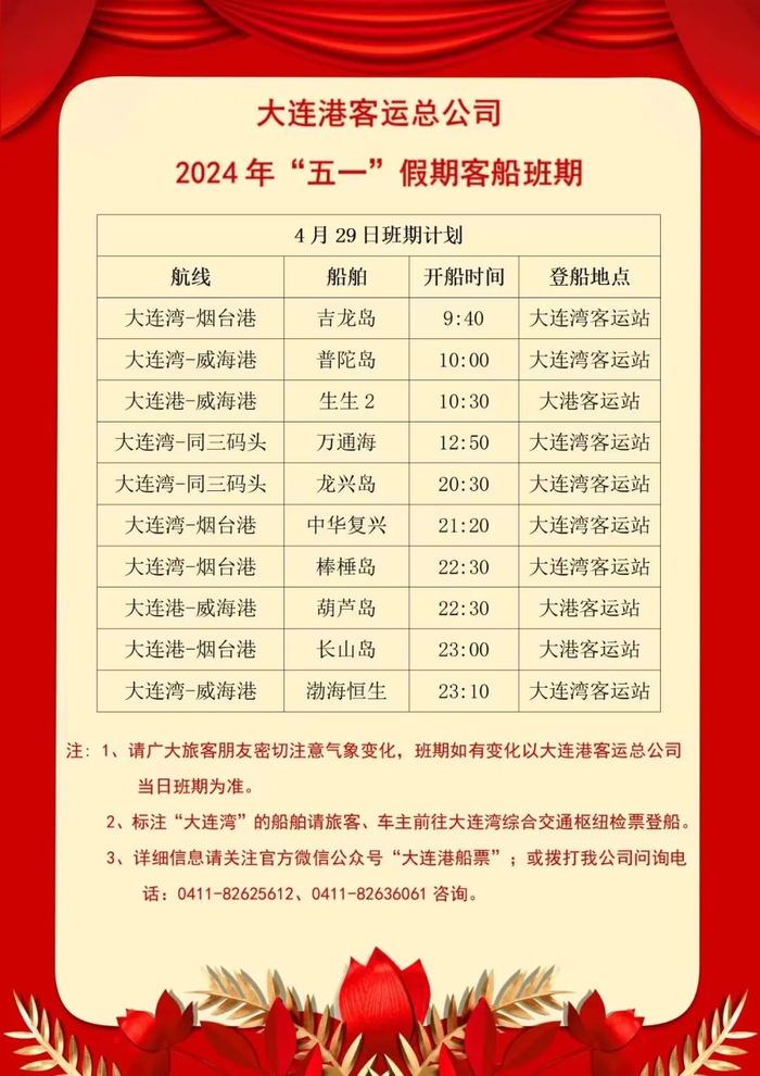 “五一”期间,预计大连港客运总公司共有出港班期57航次,出港旅客合计3万人。其中,大连至烟台出港35航次,出港旅客1.5万人;大连至威海出港20航次,出港旅客1.5万人;大连至仁川出港2航次,出港旅客0.02万人。