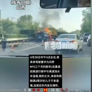 4月26日,有网友有发视频爆料,在山西夏县一高速路上,一辆黑色问界M7越野车追尾前方的洒水车,车头起火,车上3人全部遇难。