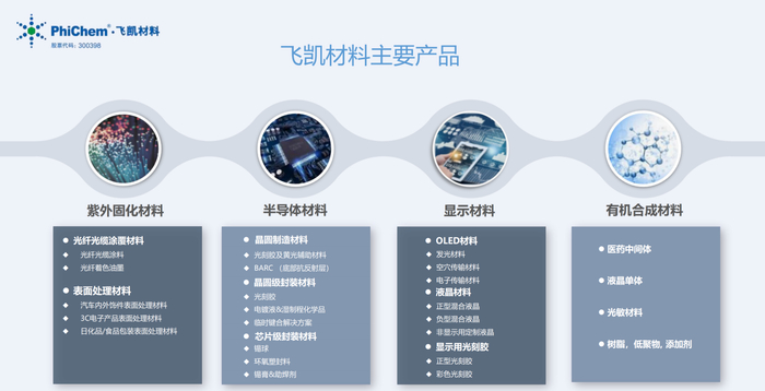 飞凯材料从光通信领域紫外固化材料的自主研发和生产开始,不断寻求行业间技术协同,目前已将核心业务范围逐步拓展至半导体材料、屏幕显示材料和有机合成材料等领域。