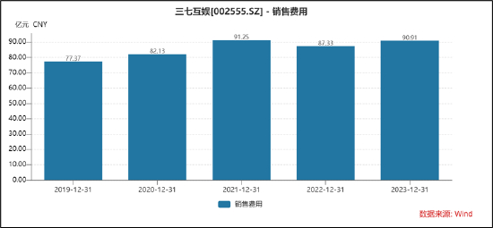 在买量模式下,公司的销售费用持续维持高位。2023年,公司的销售费用超90亿元。然而,流量带来的收入增长效应在降低。据DataEye测算,三七互娱每付出1元互联网流量费用,换来的营收已经从2018年的2.39元降为2023年的1.95元。