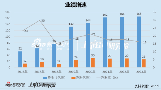 然而,公司近年却出现增收不增利情形,规模整体呈现出持续上扬态势,但利润却表现一般。我们可以看到,公司的营收规模由2016年的52亿元大幅攀升至2023年的165亿元,营收规模呈现出整体向上趋势;而公司净利润却并未随着大幅增长,净利率水平由巅峰的30%下降至16%。尤其值得注意的是,公司自2020年开始,营收持续向上但净利润却持续维持30亿元左右,去年更是下降至26亿元,出现增收不增利现象。