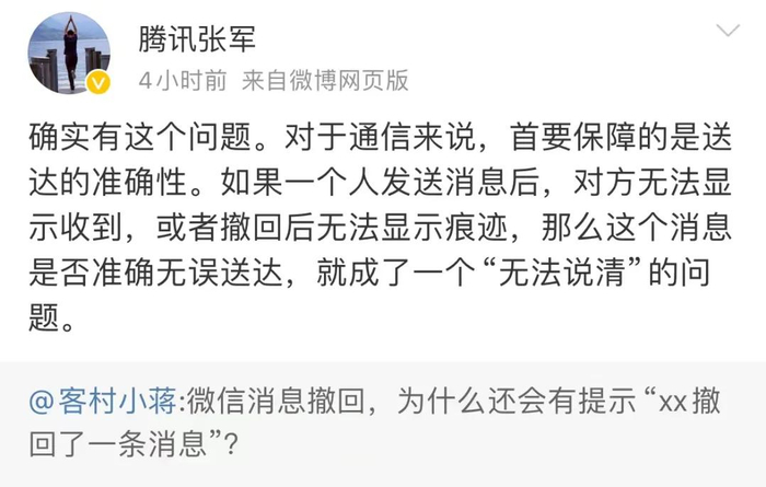 张军解释称,如果一个人发送消息后,对方无法显示收到,或者撤回后无法显示痕迹,那么这个消息是否准确无误送达,就成了一个“无法说清”的问题。