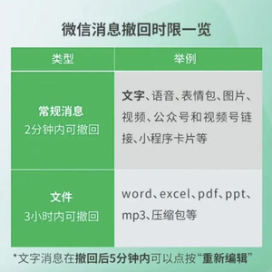 “微信派”称,具体来看,常规消息2分钟内可以撤回,如文字、语音、表情包、图片、视频、公众号、视频号链接、小程序卡片等;其中文字消息可以在撤回5分钟内重新编辑。文件3小时内可撤回,如word、excel、ppt、pdf、mp3、压缩包等。所有消息撤回之后,对方都会看到相关提醒,提示“对方撤回一条消息”。