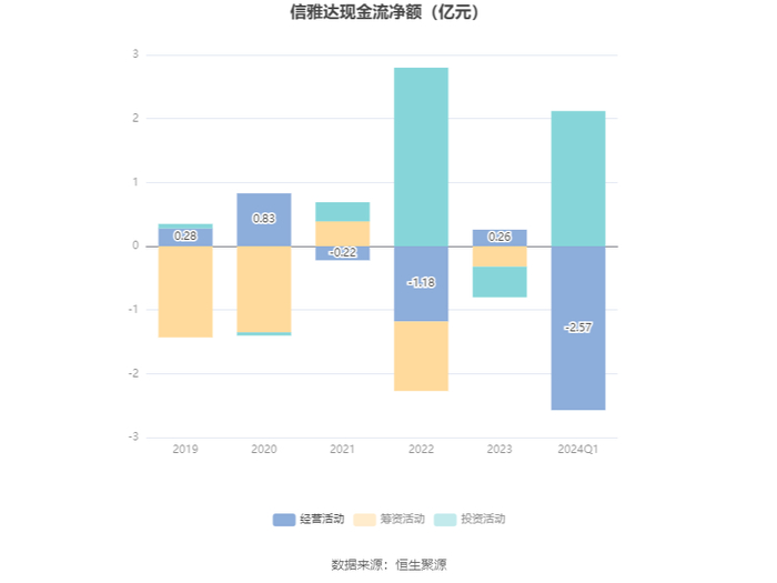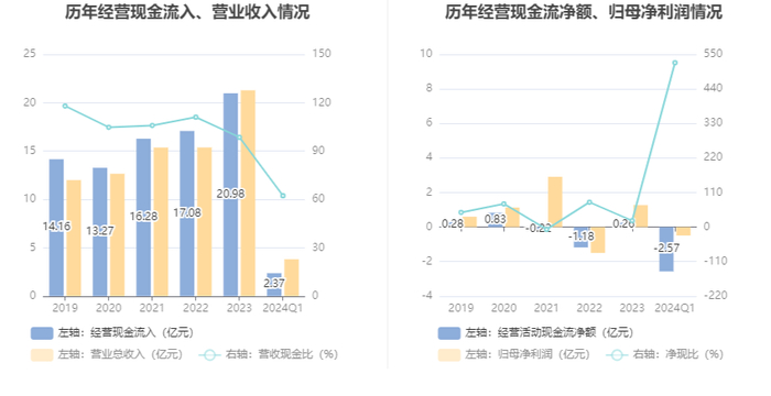 截至2024年一季度末,公司经营活动现金流净额为-2.57亿元,同比减少5288.96万元;筹资活动现金流净额0元,同比减少1250万元;投资活动现金流净额2.12亿元,上年同期为1.15亿元。
