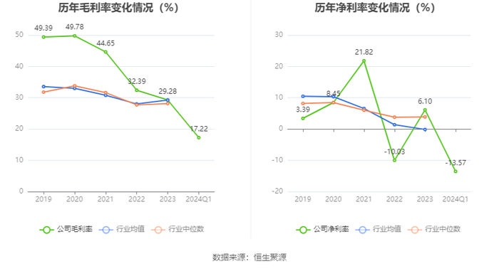 2024年第一季度,公司毛利率为17.22%,同比下降18.68个百分点;净利率为-13.57%,较上年同期下降14.27个百分点。