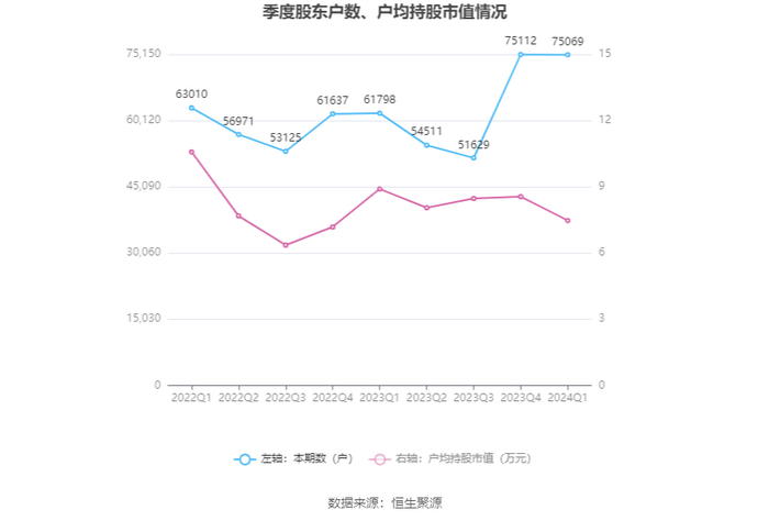 筹码集中度方面,截至2024年一季度末,公司股东总户数为7.51万户,较上年末下降了43户,降幅0.06%;户均持股市值由上年末的8.55万元下降至7.47万元,降幅为12.63%。