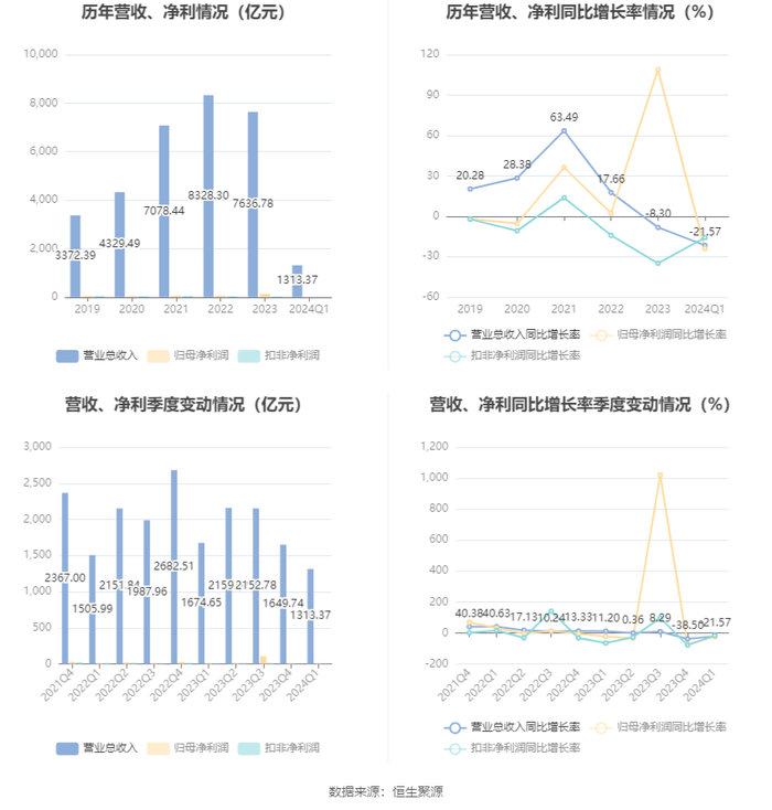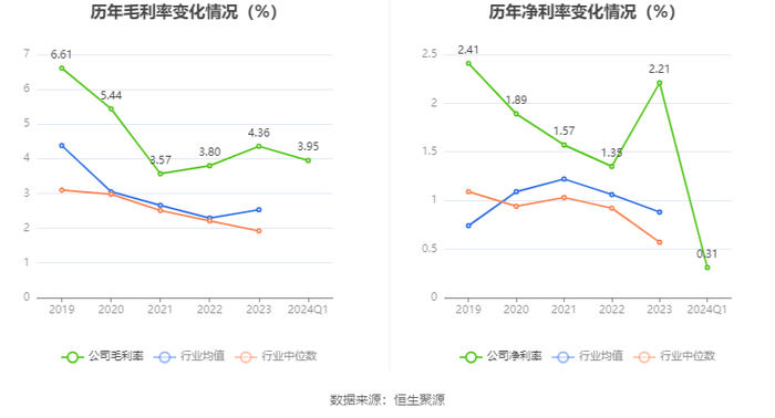 2024年第一季度,公司毛利率为3.95%,同比上升1.54个百分点;净利率为0.31%,较上年同期下降0.21个百分点。