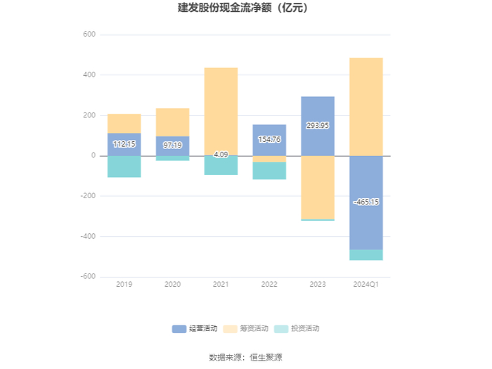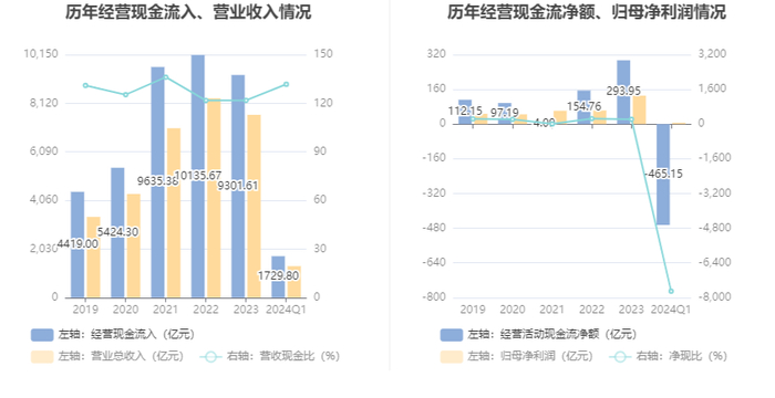 2024年第一季度,公司经营活动现金流净额为-465.15亿元,同比减少344.57亿元,主要系由于报告期房地产业务销售回款减少、支付地价款金额增加所致;筹资活动现金流净额485.82亿元,同比增加159.70亿元;投资活动现金流净额-52.54亿元,上年同期为-59.79亿元。