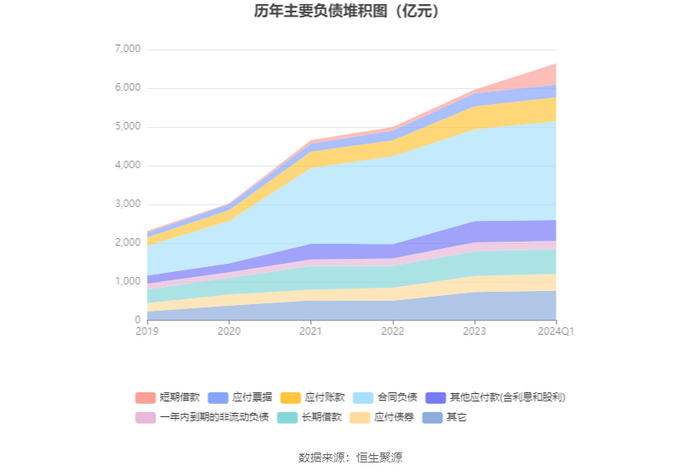 负债重大变化方面,截至2024年一季度末,公司短期借款较上年末增加472.16%,占公司总资产比重上升5.00个百分点;合同负债较上年末增加7.89%,占公司总资产比重下降0.20个百分点;其他流动负债较上年末增加19.30%,占公司总资产比重上升0.29个百分点;应付债券较上年末增加6.14%,占公司总资产比重下降0.12个百分点。