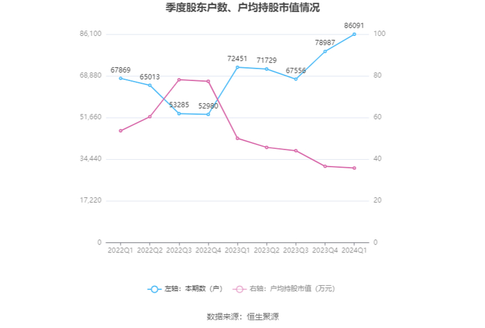 筹码集中度方面,截至2024年一季度末,公司股东总户数为8.61万户,较上年末增长了7104户,增幅8.99%;户均持股市值由上年末的36.63万元下降至35.80万元,降幅为2.27%。