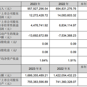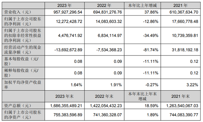 挖贝网4月29日,阿石创近日发布2023年年度报告,报告期内公司实现营业收入957,927,296.54元,同比增长37.86%;归属于上市公司股东的净利润12,272,428.72元,同比下滑12.86%。