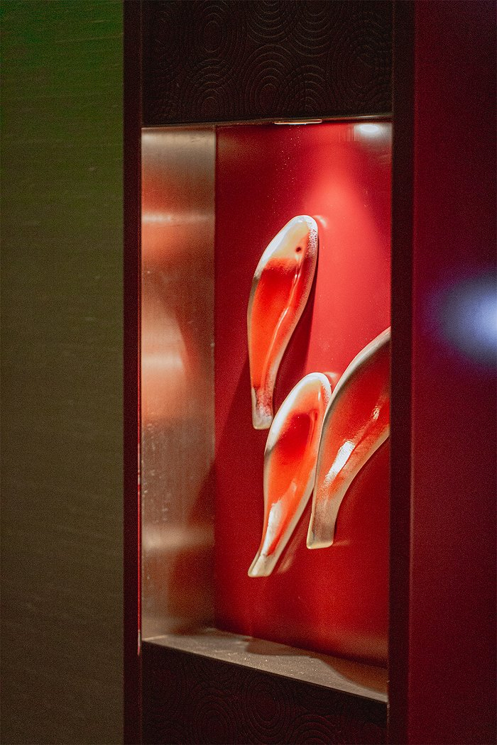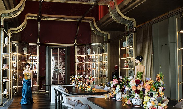 四周随处可见精心遴选的古典工艺品、精美的刺绣雕花家具以及中式美学独有的色彩韵味,无不在铺垫一场经典流传精神永续的鸿篇;而其近在眼前触手可及,又徐徐拉住了今人的手,引你抚触流淌在血脉之中的文化本源。