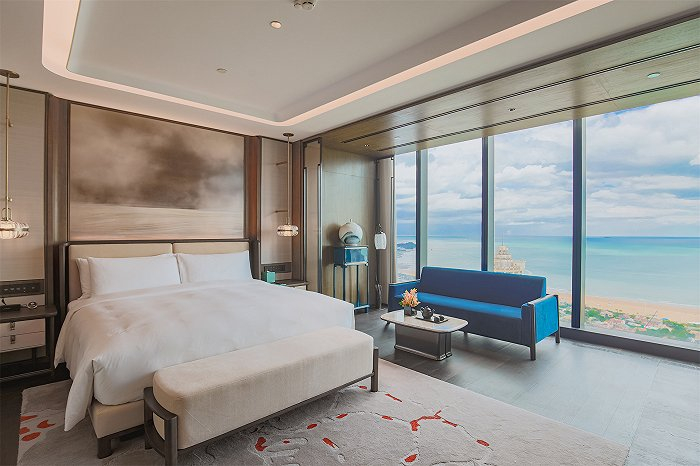 步入酒店客房,可见抽象荷花图案在酒红色渐变地毯上若隐若现。每间客房门外皆静置一件精心挑选的艺术品,既是中华文化艺术之缩影,亦彰显谦逊沉着之待客礼仪。同时,从湛蓝大海至皇家院落,从海洋蓝、夕阳金至中国红的多种主题房型,融入沉稳的深色木材与青铜材质的转换,映衬出灼灼韶华风禾尽起的盛世胜景。