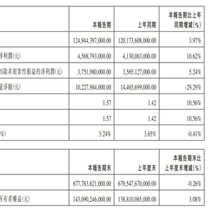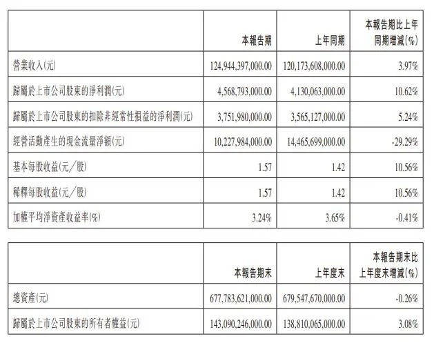 报告期归属于上市公司股东的净利润 45.69 亿元,同比增长 10.62%;归属于上市公司股东的扣除非经常性损益的净利润 37.52 亿元,同比增长 5.24%;基本每股收益 1.57 元╱股,同比增长 10.56%;研究及开发费用 106.1 亿元,同比增长 70.10%。