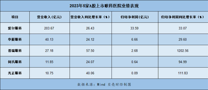 2023年业绩显示,A股上市的5家眼科医院均实现营收、归母净利润的同比增长。爱尔眼科2023年营收突破200亿元,归母净利润约为33.59亿元,营收、归母净利润同比增速均超20%。
