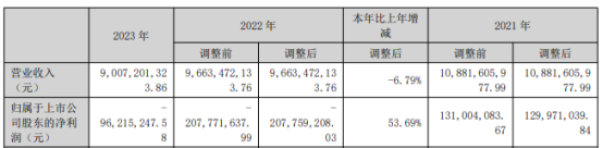 挖贝网4月29日,常山北明 近日发布2023年年度报告,报告期内公司实现营业收入9,007,201,323.86元,同比下滑6.79%;归属于上市公司股东的净利润-96,215,247.58元,较上年同期亏损减少。