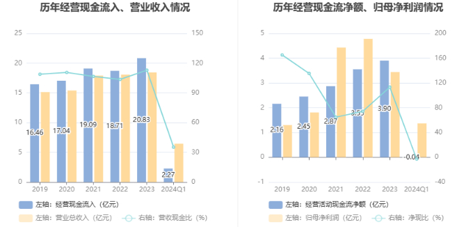 截至2024年一季度末,公司经营活动现金流净额为-413.86万元,同比增加9750.89万元;筹资活动现金流净额0元,与同期相比基本不变;投资活动现金流净额-1142.39万元,上年同期为7043.67万元。