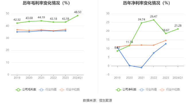 2024年第一季度,公司毛利率为48.50%,同比上升1.02个百分点;净利率为21.28%,较上年同期下降1.61个百分点。