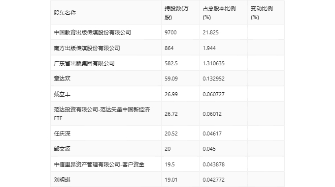 一季报显示,2024年一季度末公司十大流通股东中,新进股东为章达欢、戴立丰、任庆深、邹文波、中信里昂资产管理有限公司-客户资金、刘明琪,取代了上年末的李宁、香港中央结算有限公司、UBS AG、MERRILL LYNCH INTERNATIONAL、夏银浩、宋国江。在具体持股比例上,范达投资有限公司-范达矢量中国新经济ETF持股有所上升,南方出版传媒股份有限公司、广东省出版集团有限公司持股有所下降。