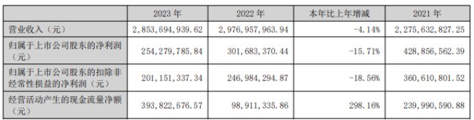 挖贝网4月29日,可孚医疗 近日发布2023年年度报告,报告期内公司实现营业收入2,853,694,939.62元,同比下滑4.14%;归属于上市公司股东的净利润254,279,785.84元,同比下滑15.71%。