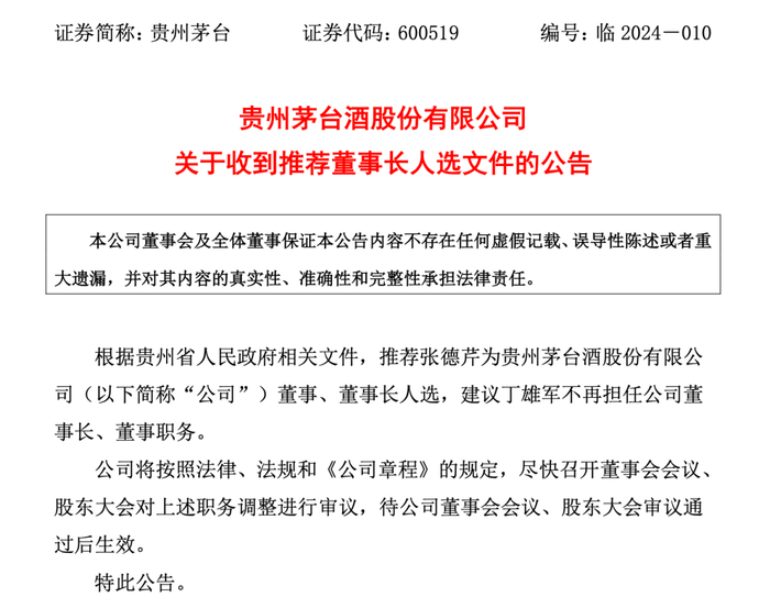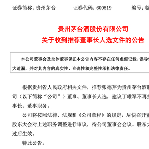 刚刚,贵州茅台发布公告称,根据贵州省人民政府相关文件,推荐张德芹为贵州茅台酒股份有限公司(以下简称“公司”)董事、董事长人选,建议丁雄军不再担任公司董事长、董事职务。