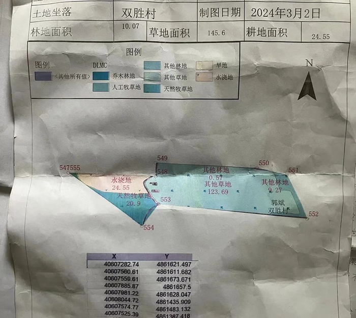 双胜村承包户收到的地类图,180余亩土地中,耕地只剩不足25亩。据该承包户介绍,被定为其他草地的部分,他也曾长期种植玉米等作物,在被定为水浇地和天然牧草的地块上,他曾为完成“三三制”任务而栽种过一些沙棘。