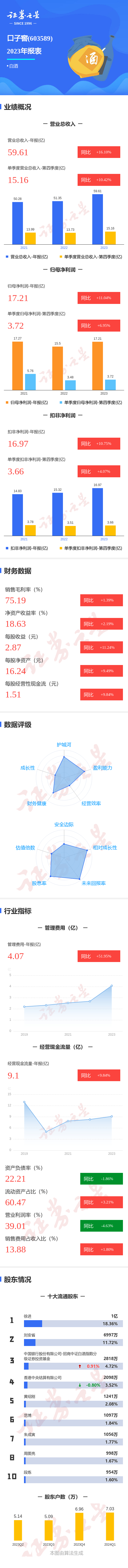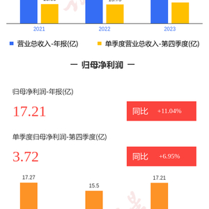 证券之星消息,口子窖2023年年报显示,公司主营收入59.62亿元,同比上升16.1%;归母净利润17.21亿元,同比上升11.04%;扣非净利润16.98亿元,同比上升10.75%;其中2023年第四季度,公司单季度主营收入15.16亿元,同比上升10.42%;单季度归母净利润3.73亿元,同比上升6.95%;单季度扣非净利润3.66亿元,同比上升4.07%;负债率22.21%,投资收益2037.08万元,财务费用-1153.36万元,毛利率75.19%。