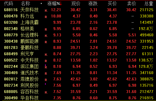 场内超4500股飘红,逾百股涨停。地产板块爆发,万科A、金地集团(600383)、特发服务等逾30股涨停;券商板块持续活跃,国盛金控(002670)两连板,太平洋(601099)涨停;半导体板块走强,清溢光电、安集科技(688019)涨近17%;汽车拆解概念亮眼,华宏科技(002645)、天奇股份(002009)、格林美(002340)等涨停;固态电池概念拉升,科力远(600478)、上海洗霸(603200)等涨停,恩捷股份(002812)涨超7%,宁德时代(300750)涨逾5%创年内新高。