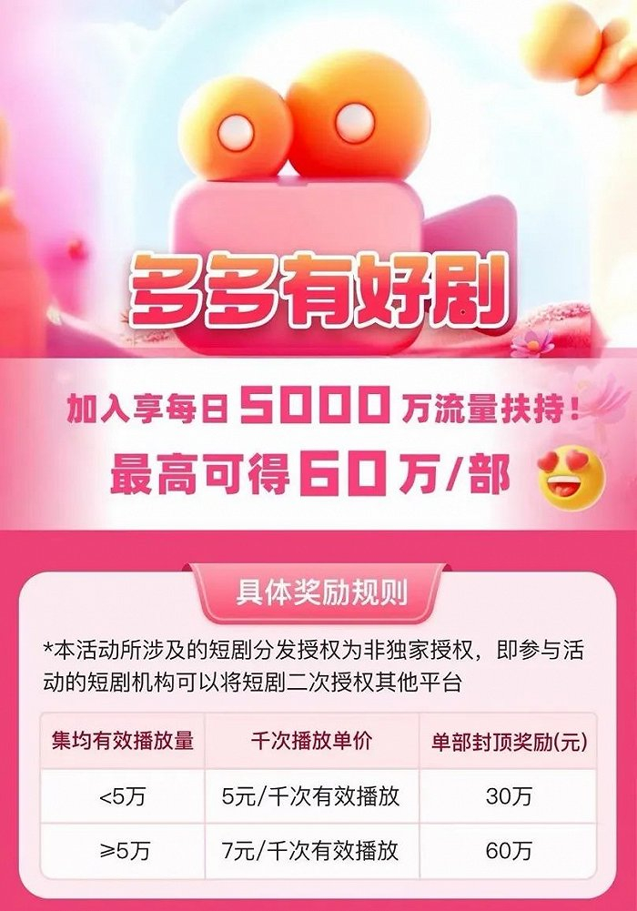 与平台定制精品短剧的路径不同,批量上线免费短剧的平台主要是吸引短剧机构授权的方式。“拼多多很多都是二轮剧”,一位短剧供应商告诉我们。另一位MCN机构方负责人也表示,他们已经在和拼多多平台合作短剧授权了。