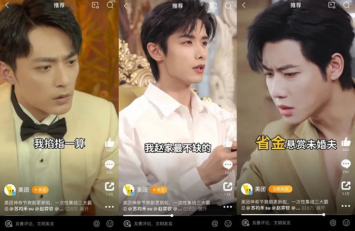 美团则是以借助“霸总”短剧的形式,在营销节点前后吸引流量和话题讨论,并以霸总合体直播间等方式,完成一次事件营销。在神券节前夕,美团发布了一则预告,集合了《苏总的18日恋人》《小美赵总请您回家》《代总的追爱计划》三个短剧故事,4月18日当天,三位霸总齐现直播间,引导观众了解产品、现场下单拔草。