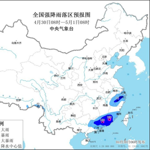 预计,4月30日08时至5月1日08时,浙江大部、江西南部、福建中南部、广西东部、广东中北部等地部分地区有大到暴雨,其中,福建南部、广东北部等地部分地区有大暴雨(100~180毫米)(见图1),部分地区伴有短时强降水(最大小时降雨量30~60毫米,局地可超过80毫米);湖南南部、江西东部和南部、浙江东部、福建北部和西南部、广西东部和南部、广东西部和中北部等地的部分地区将有8级以上雷暴大风或冰雹天气,其中江西南部、福建西南部、广西东北部、广东北部等地的部分地区将有10级以上雷暴大风,最大风力12级以上,并可能有龙卷(见图2)。中央气象台4月30日06时继续发布暴雨黄色预警和强对流天气橙色预警。