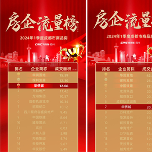 2023年,华侨城以59.8万㎡的业绩位列成都房企销售面积排名第9名、销售金额94.5亿元位列成都第12名,业绩金额双双登榜。在克而瑞四川发布的2024年一季度成都商品房房企流量榜上,华侨城位列面积榜单第三、成交金额榜单第七,旗下多个项目表现亮眼。多年来,华侨城以“优质生活创想家”的责任担当,用脚踏实地的建设实践,不断回答什么才是“好房子”,不断为成都打造理想人居。