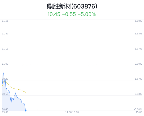 04月30日,鼎胜新材(603876)股价大幅下跌,截至10点10分,鼎胜新材下跌5.00%,报10.45元/股,成交1.24亿元,换手率1.32%,振幅4.45%。