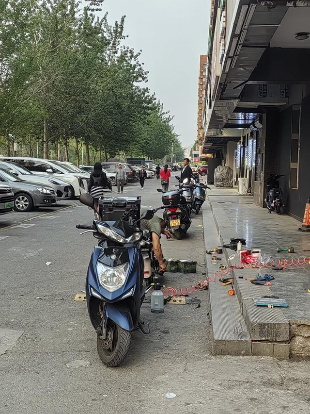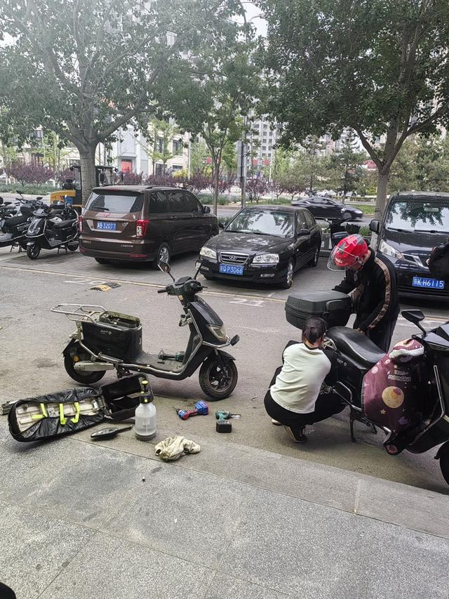 褡裢坡附近一门店人员正在修车,电动车电池仓被打开