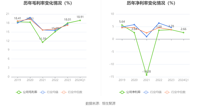 2024年第一季度,公司毛利率为18.91%,同比上升5.08个百分点;净利率为2.66%,较上年同期下降0.85个百分点。
