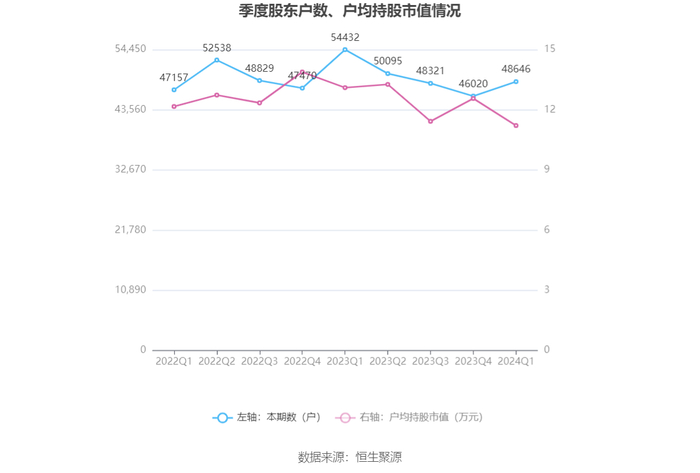 筹码集中度方面,截至2024年一季度末,公司股东总户数为4.86万户,较上年末增长了2626户,增幅5.71%;户均持股市值由上年末的12.56万元下降至11.21万元,降幅为10.75%。
