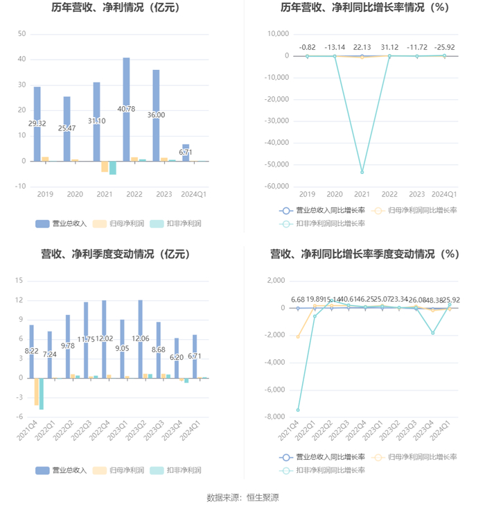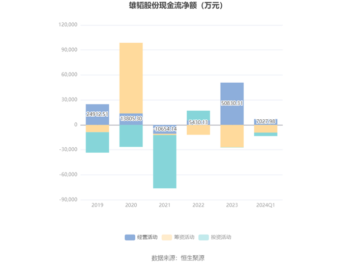 2024年第一季度,公司经营活动现金流净额为7027.98万元,同比下降74.35%,主要系本期锂电池行业不景气,营收下降所致;筹资活动现金流净额-9208.34万元,同比增加7914.50万元,主要系上期偿还欠款较多所致;投资活动现金流净额-4171.81万元,上年同期为-1.55亿元,主要系上期锂电业务板块投入较多所致。