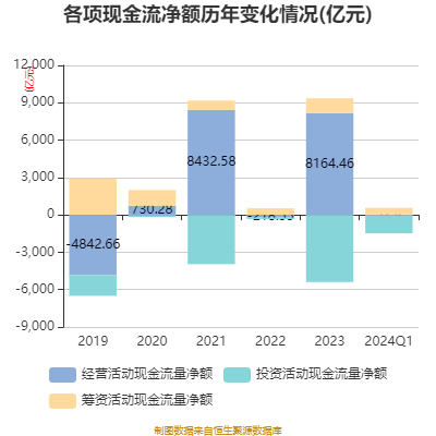 2024年第一季度,公司经营活动现金流净额为32.40亿元,同比下降99.34%;筹资活动现金流净额527.62亿元,同比增加1433.87亿元;投资活动现金流净额-1480.16亿元,上年同期为-1772.21亿元。