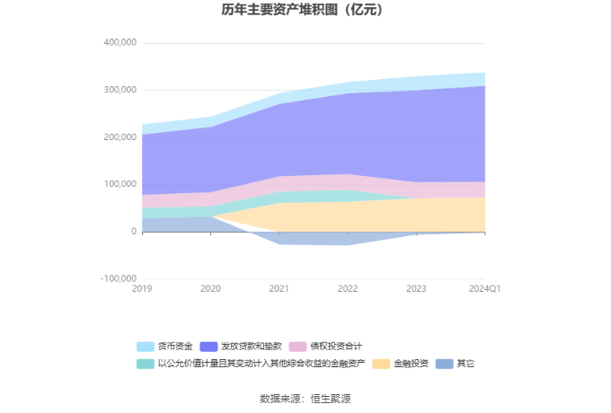 资产重大变化方面,截至2024年一季度末,公司货币资金较上年末减少5.19%,占公司总资产比重下降0.81个百分点;存放同业款项较上年末增加57.12%,占公司总资产比重上升0.79个百分点;债权投资合计较上年末减少1.78%,占公司总资产比重下降0.56个百分点;发放贷款和垫款较上年末增加4.57%,占公司总资产比重上升0.46个百分点。