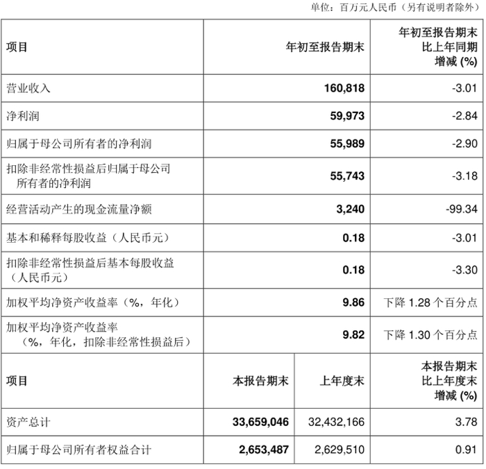 中证智能财讯 中国银行(601988)4月30日披露2024年一季报。2024年第一季度,公司实现营业总收入1608.18亿元,同比下降3.01%;归母净利润559.89亿元,同比下降2.90%;扣非净利润557.43亿元,同比下降3.18%;经营活动产生的现金流量净额为32.40亿元,同比下降99.34%;报告期内,中国银行基本每股收益为0.18元,加权平均净资产收益率为2.47%。