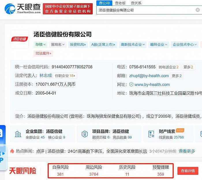 此外,天眼查显示汤臣倍健自身风险近400条,周边风险高达3700多条。