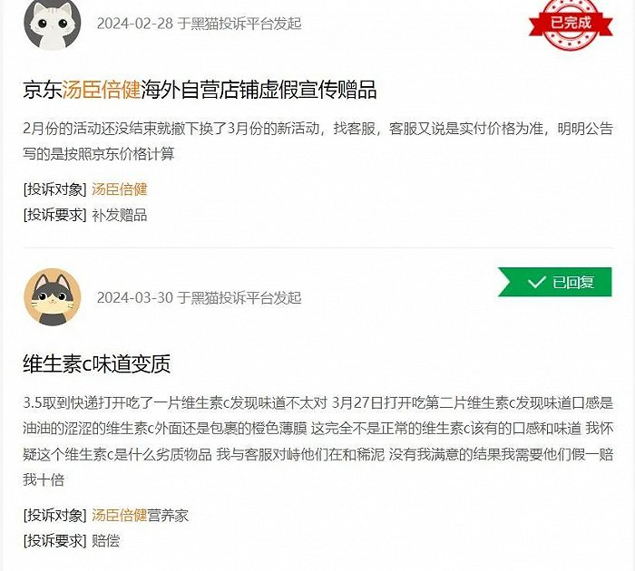 黑猫投诉网站显示,汤臣倍健相关投诉多达360条,内容包括虚假宣传、线上线下价格差距大、产品质量等问题。