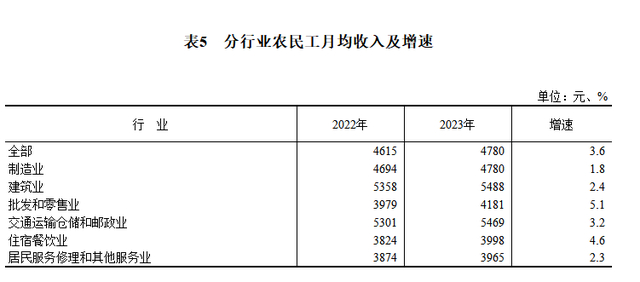 分行业看,六大行业收入均保持增长。从事制造业农民工月均收入4780元,增长1.8%;从事建筑业农民工月均收入5488元,增长2.4%;从事批发和零售业农民工月均收入4181元,增长5.1%;从事交通运输仓储和邮政业农民工月均收入5469元,增长3.2%;从事住宿餐饮业农民工月均收入3998元,增长4.6%;从事居民服务修理和其他服务业农民工月均收入3965元,增长2.3%。