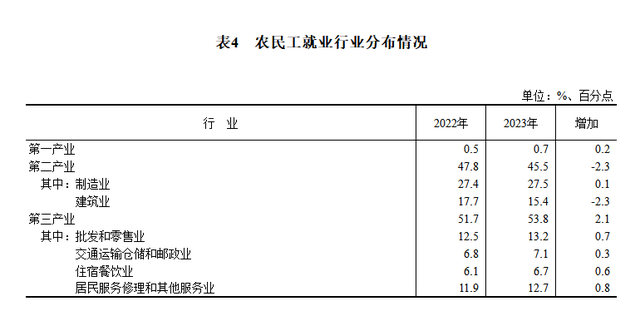 分产业看,农民工中从事第三产业的占53.8%,比上年提高2.1个百分点;从事第二产业的占45.5%,比上年下降2.3个百分点。