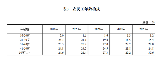 农民工平均年龄43.1岁,比上年提高0.8岁。其中,本地农民工平均年龄46.6岁,外出农民工平均年龄38.9岁。从年龄结构看,农民工中40岁及以下占44.6%,41—50岁占24.8%,50岁以上占30.6%。