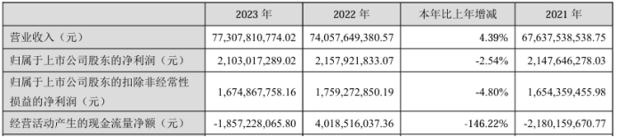 挖贝网4月30日,紫光股份 近日发布2023年年度报告,报告期内公司实现营业收入77,307,810,774.02元,同比增长4.39%;归属于上市公司股东的净利润2,103,017,289.02元,同比下滑2.54%。