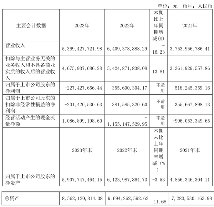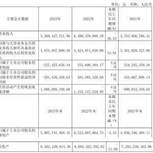 挖贝网4月30日,宁波韵升 近日发布2023年年度报告,报告期内公司实现营业收入5,369,427,721.98元,同比下滑16.23%;归属于上市公司股东的净利润-227,427,656.44元,较上年同期由盈转亏。