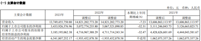 挖贝网4月30日,雅戈尔 近日发布2023年年度报告,报告期内公司实现营业收入13,749,455,750.80元,同比下滑7.23%;归属于上市公司股东的净利润3,433,926,376.96元,同比下滑32.31%。