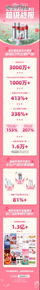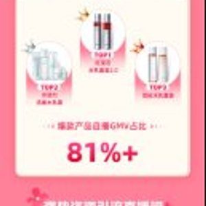 通过多维度、精细化的活动玩法,珀莱雅本次超品日活动总曝光超1.3亿,品牌总GMV环比增速超413%,总订单量环比增加超338%,红宝石水乳套装2.0、水动力洁面水乳霜、双抗水乳套装三款王牌产品成为销量TOP3。