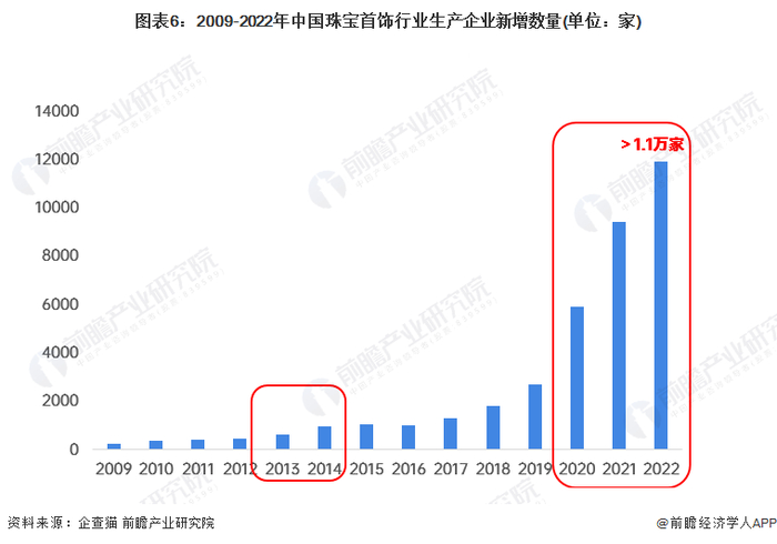 2009-2022年,中国珠宝首饰行业生产企业增量整体趋于增长,且呈现两拨增长热潮,第一波增长热潮处于2013-2014年间,企业增量突破1000家;第二波热潮处于2020-2021年间,且2021年的企业增量突破9000家。